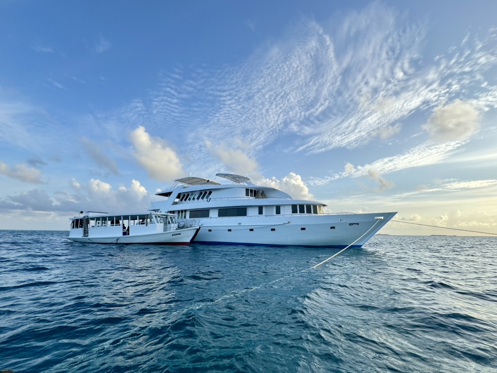 Pro Tag werden 2–3 Tauchgänge angeboten, in der Regel 3, sofern keine längeren Überfahrten erforderlich sind. Die Tauchgänge erfolgen von der Dhoni aus und beinhalten einen Nachttauchgang pro Reise. Die Tauchplätze werden sorgfältig ausgewählt, ausführliche Briefings finden in englischer Sprache statt und können bei Bedarf ins Deutsche übersetzt werden. Die Malediven bieten beeindruckende Unterwassererlebnisse – von Korallengärten bis hin zu Begegnungen mit Mantarochen, Walhaien, Hammerhaien, Tigerhaien, Bullenhaien, Gitarrenrochen und weiterer Meeresfauna. Getaucht wird in eigenverantwortlichen Buddy-Teams, begleitet von erfahrenen Tauchguides, die die Highlights der jeweiligen Spots zeigen. Taucher müssen in der Lage sein, selbstständig im Buddy-Team aufzutauchen und bei Bedarf eine Signalboje (SMB) zu setzen.